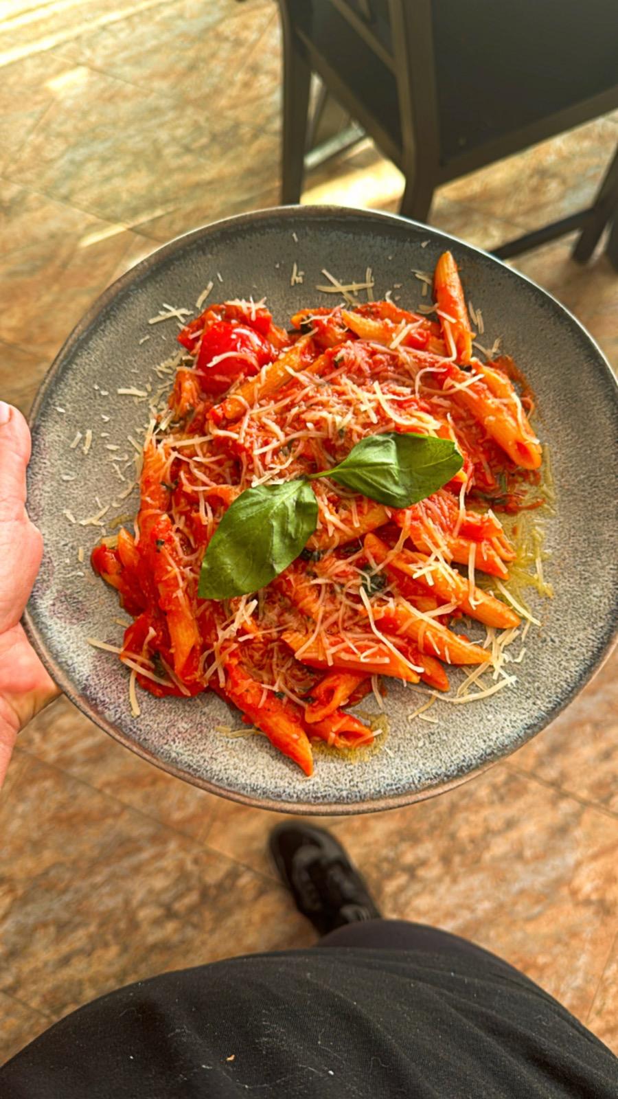 Un clasic italian reinterpretat cu prospețime și simplitate. Penne al dente îmbrăcate generos într-un sos bogat de roșii, aromatizate cu usturoi, ulei de măsline extravirgin și busuioc proaspăt, apoi presărate cu parmezan fin pentru un gust autentic și echilibrat. Ideal pentru iubitorii de paste ușoare, dar pline de savoare – o alegere delicioasă și reconfortantă, exact ca în inima Italiei.