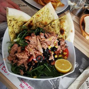 Salata mixata, ceapa, rosii, castraveti, masline, rucola, lamaie, telemea, foccacia, baby spanac, ulei, sare si otet